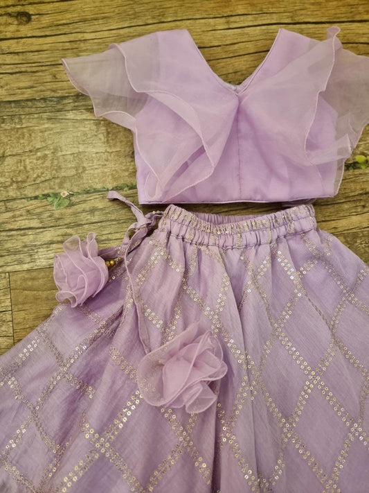 Lavender  chanderi lehenga with self gold sequins and cute tassels, pink ruffled organza blouse.